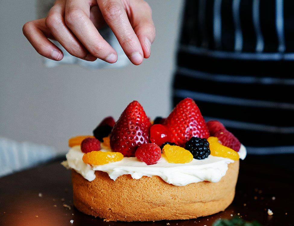 Hand reaching onto berry cake